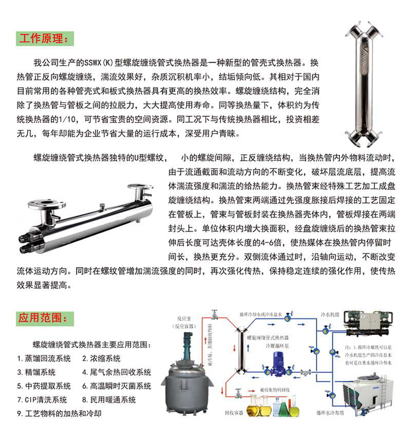 螺旋纏繞管式換熱器是我公司在引進(jìn)先進(jìn)換熱技術(shù)的基礎(chǔ)上,與山東建筑大學(xué)聯(lián)合研制開(kāi)發(fā)的新型換熱設(shè)備。是新一代換熱產(chǎn)品中的代表作品,主要適用于汽-液換熱工況,與其他形式的換熱器相比,換熱系數(shù)提高1-3倍,廣泛應(yīng)用于制藥、精細(xì)化工、食品飲料、石油化工、熱電聯(lián)產(chǎn)、洗浴、區(qū)域供熱等場(chǎng)合。